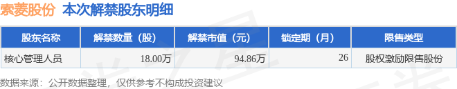 证券之星消息,根据市场公开信息整理,索菱股份(002766)于7月21日将有18.0万股限售股份解禁,为公司股权激励限售股份,占公司总股本0.02%。(本次数据根据历史公告整理得出,实际情况以上市公司最新公告为准)最近一年内,该股累计解禁299.0万股,占总股本的0.35%。本次解禁后,公司还有813.16万股限售股份,占总股本0.94%。具体如下图所示: