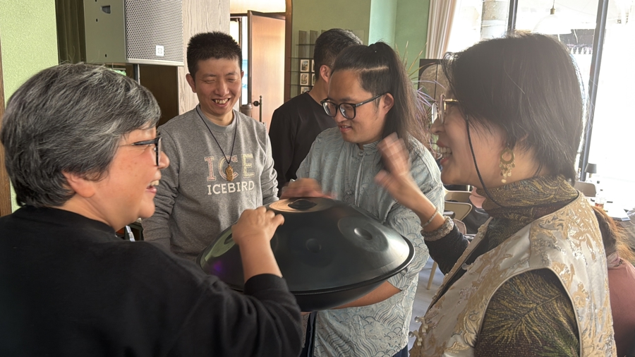 闻阿姨与好姊妹体验手碟。李昂 摄