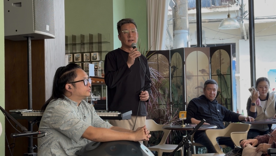 “音乐下午茶”品牌主理人时俊介绍乐团。李昂 摄